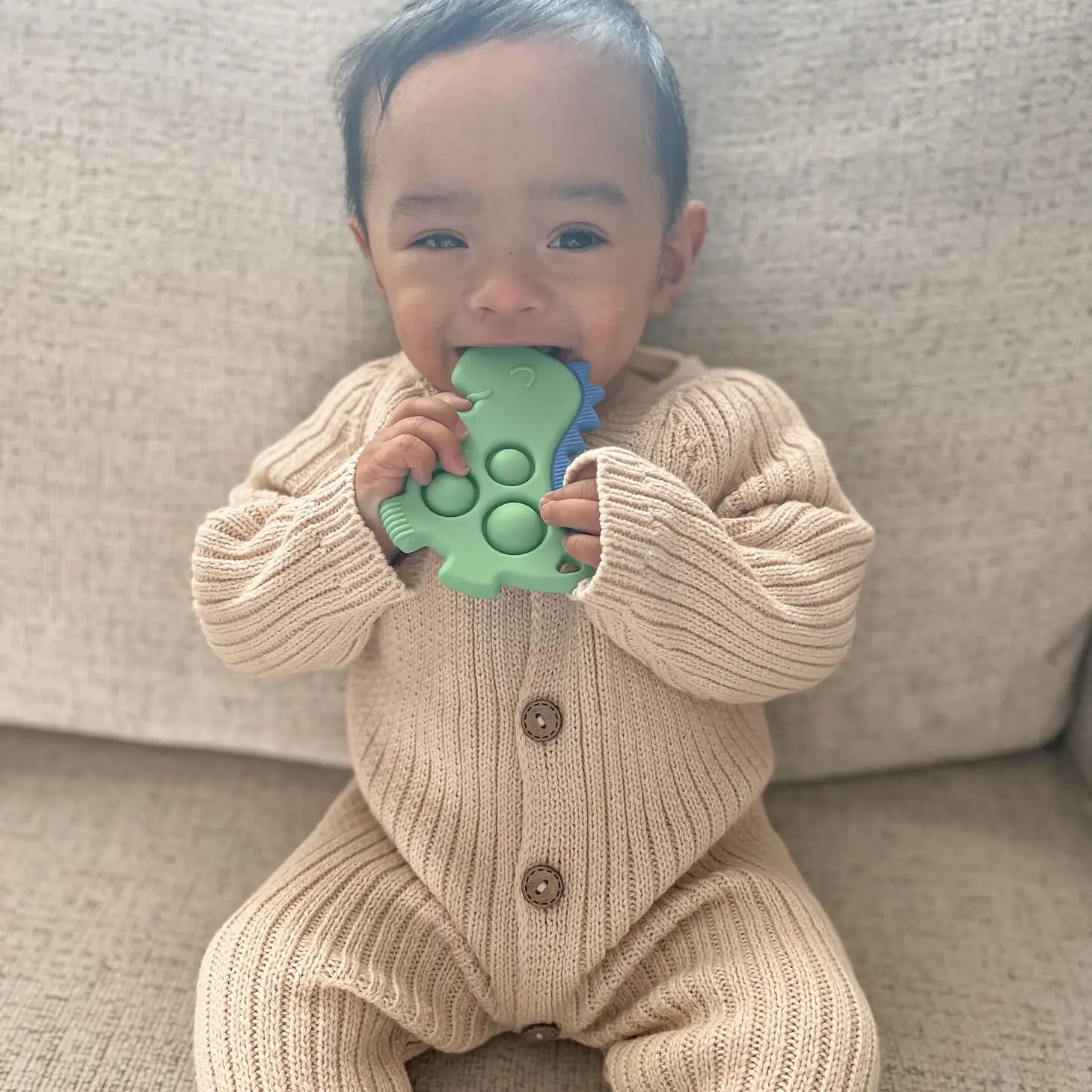 Chew on this! A pop of personality: a teething bestie & sensory toy all-in-one! Our Itzy Pop™ engages baby with popping sounds & movement while the raised textures gently soothe sore gums. Pop it in your bag or clip it for easy, fun, and safe relief while on-the-go. - BPA-free and PVC-free - 100% food grade silicone - Ages 3m+