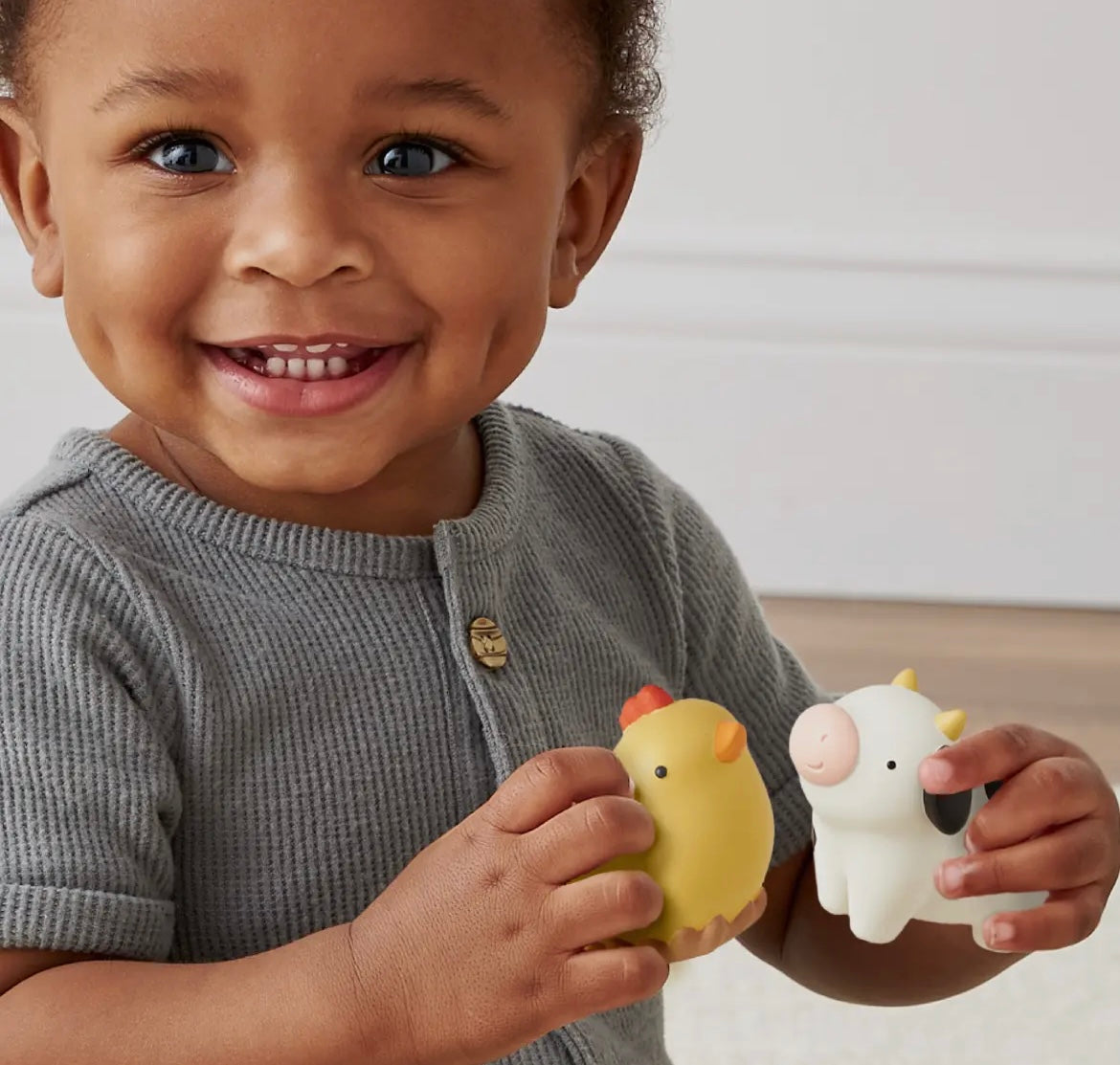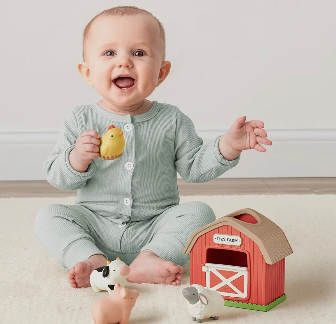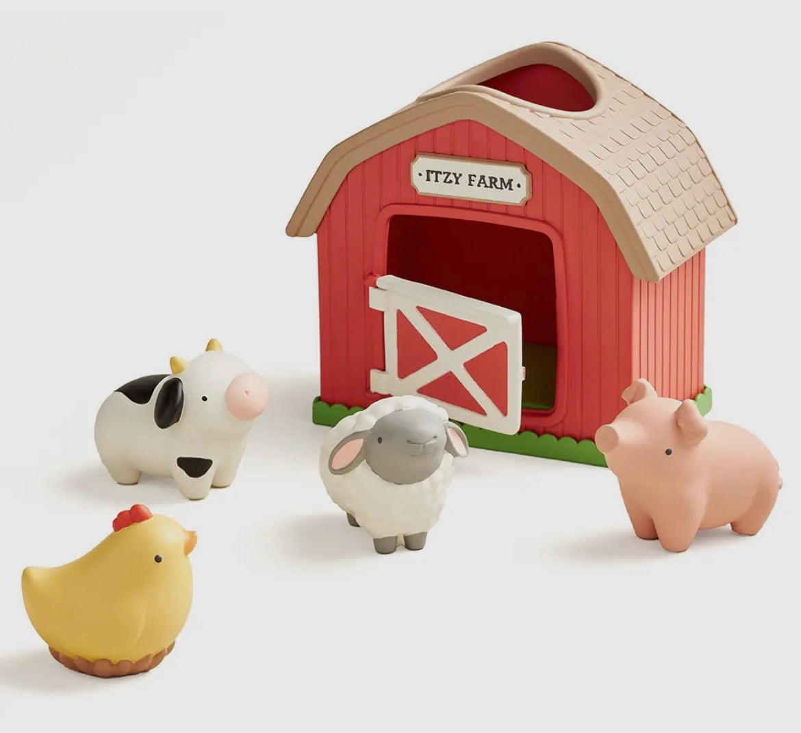 Featuring a mini barn with hinged door and rooftop opening plus four soft, squeezy animals, your babe's imagination will go through the roof as they explore put-and-take play, learn object permanence, and create endless storytelling adventures.