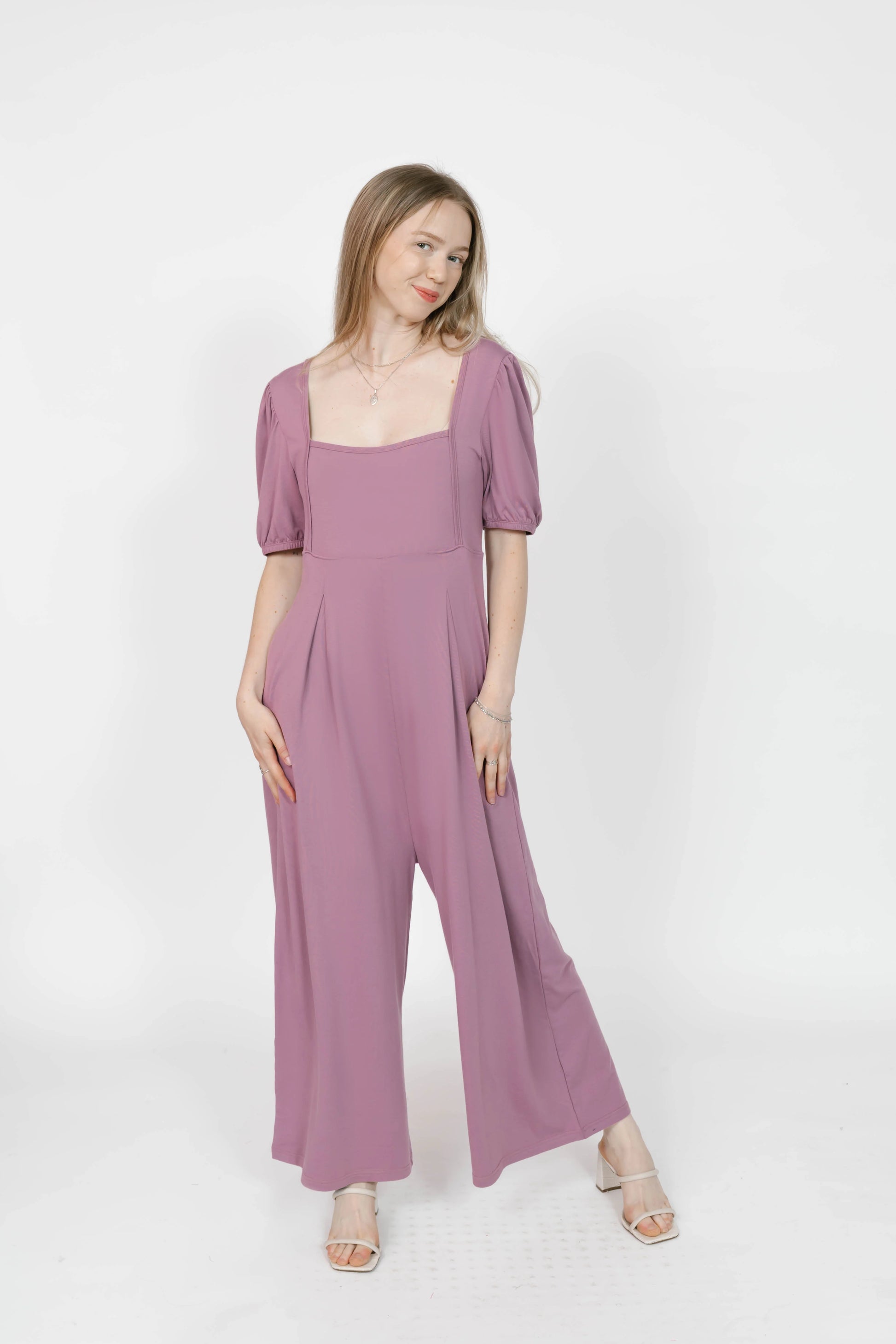 - This romper features a square neck line, a fitted top and slightly cropped wide leg pant